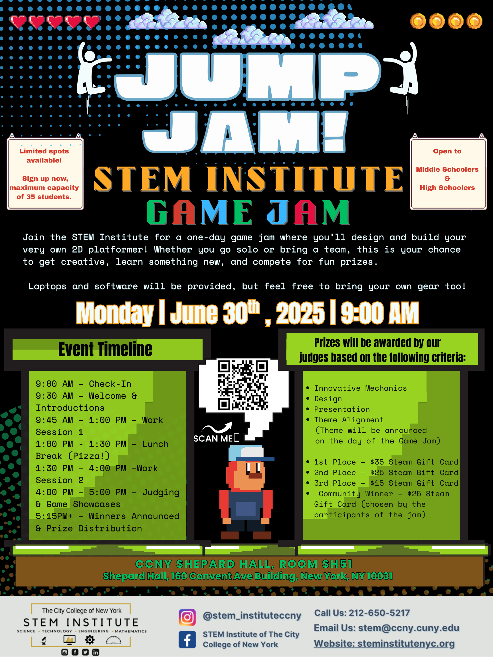 Jump Jam was an in-person game jam focused on creating 2D platformer games centered around the theme of “Lost Signal” and digital mental health. Congratulations to all the participants, your projects were incredible stepping stones toward larger creations that can truly impact how young people think about their mental well-being.